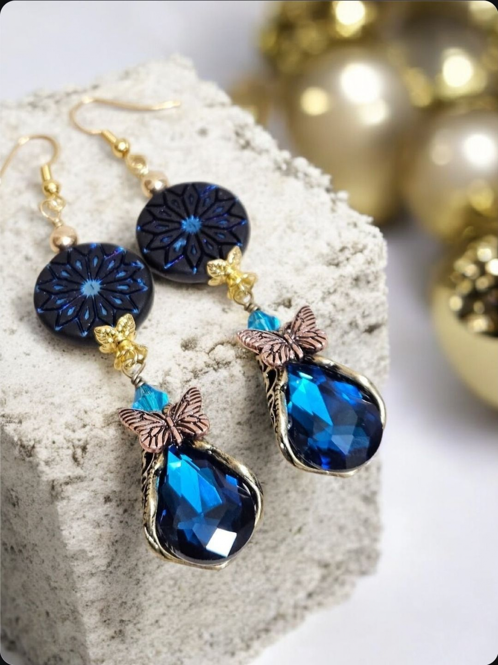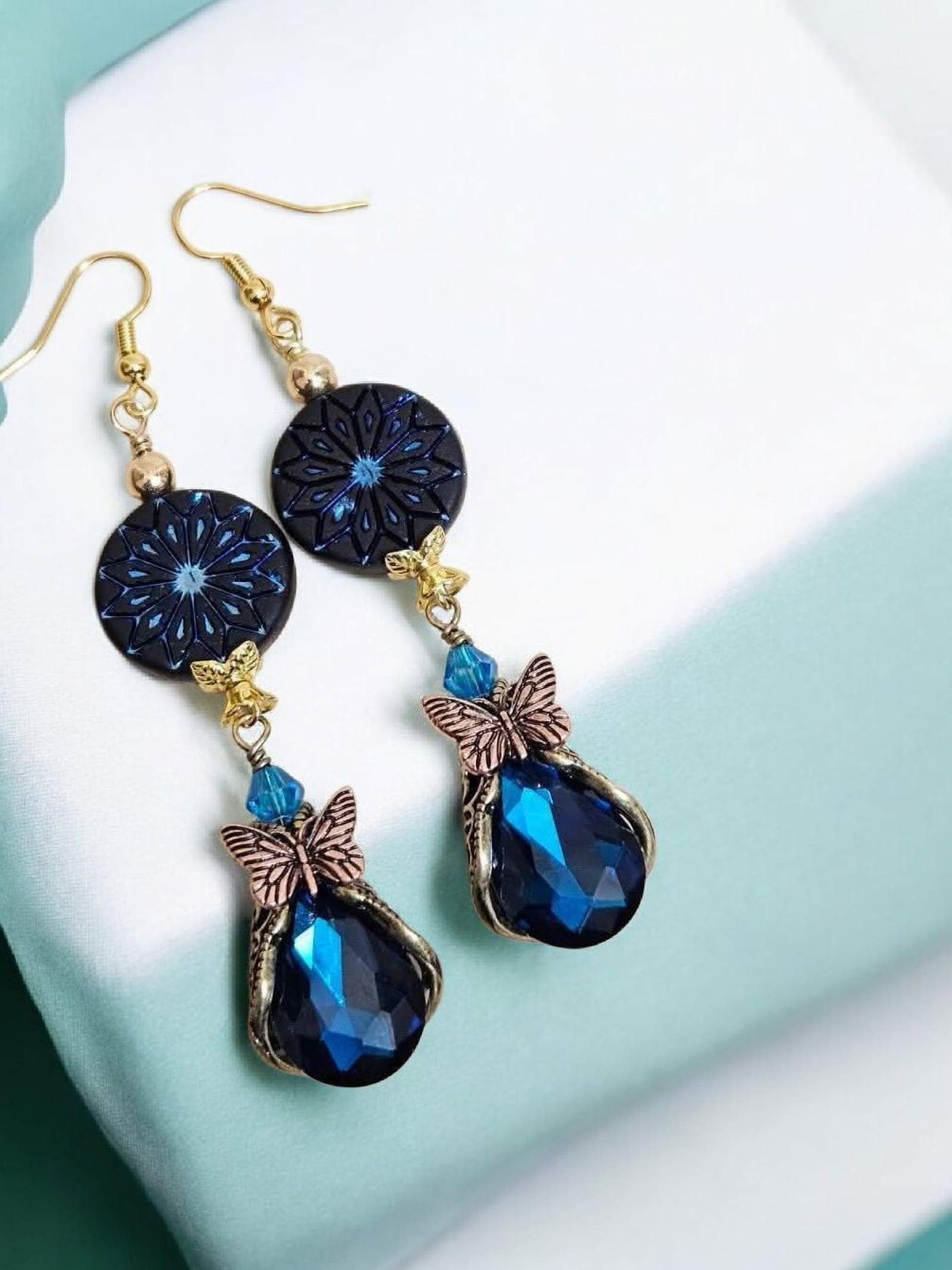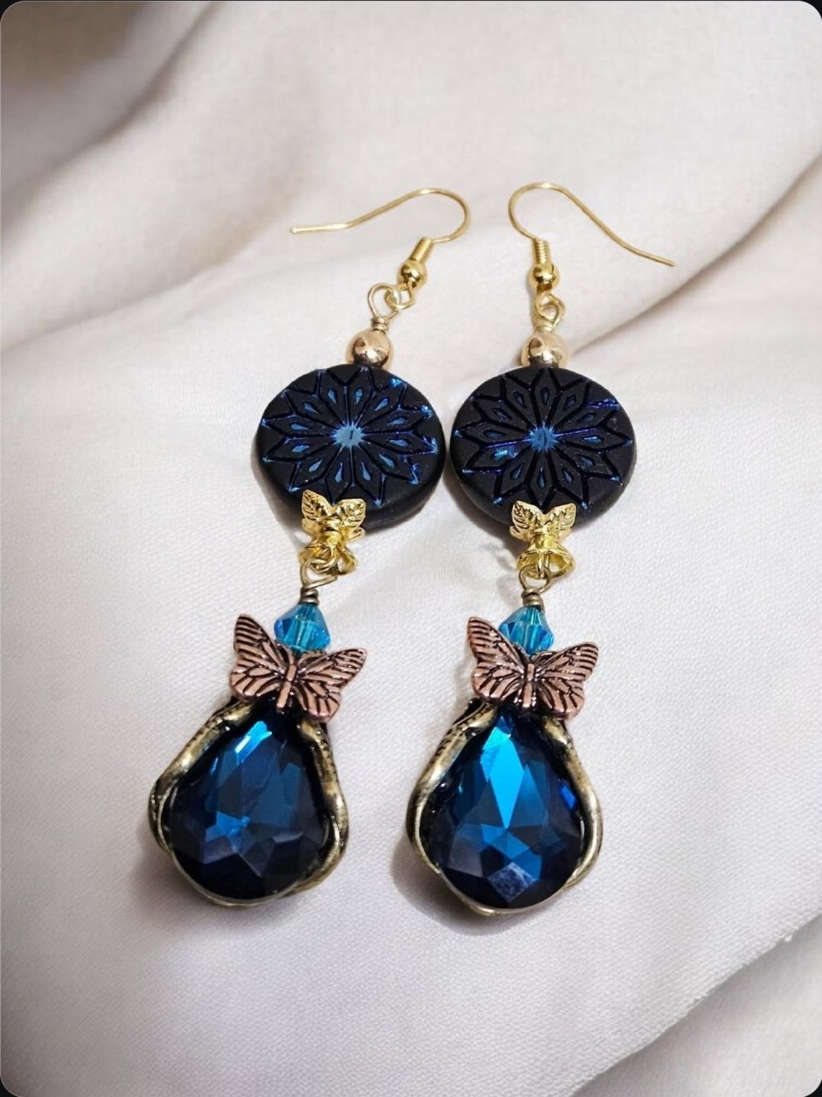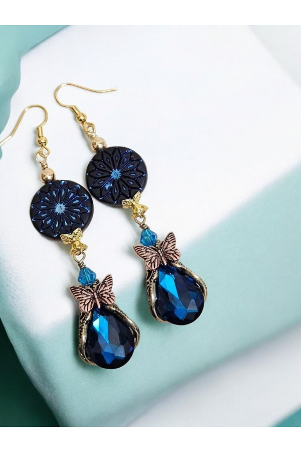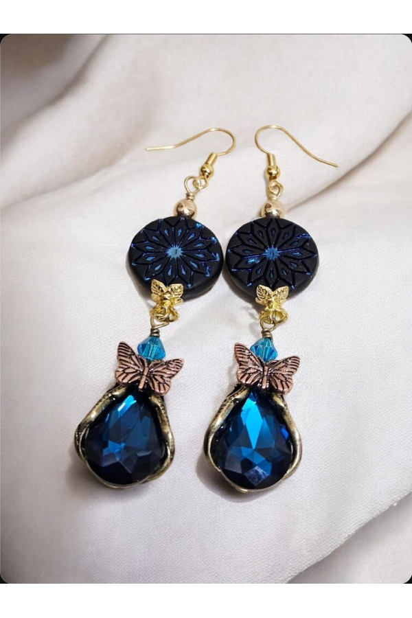 Fabulous butterfly embellished crystal charms paired with double-sided Czech coins. Measure 3.27"