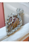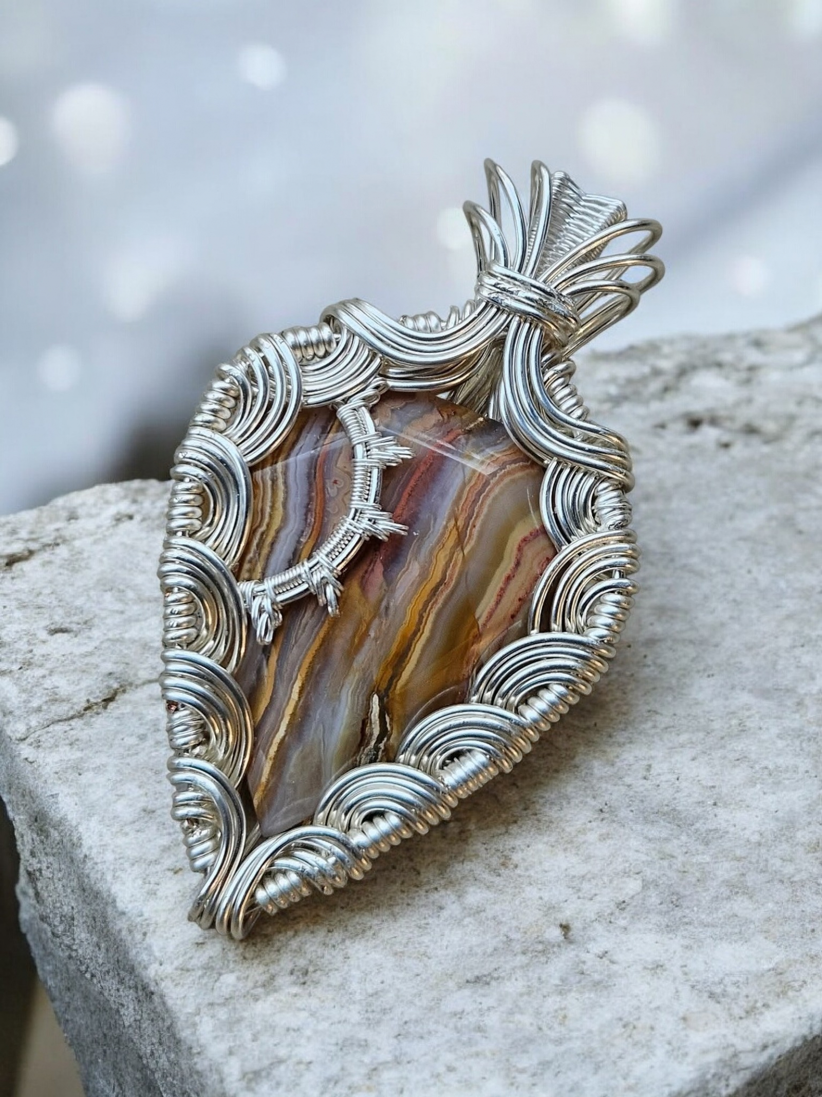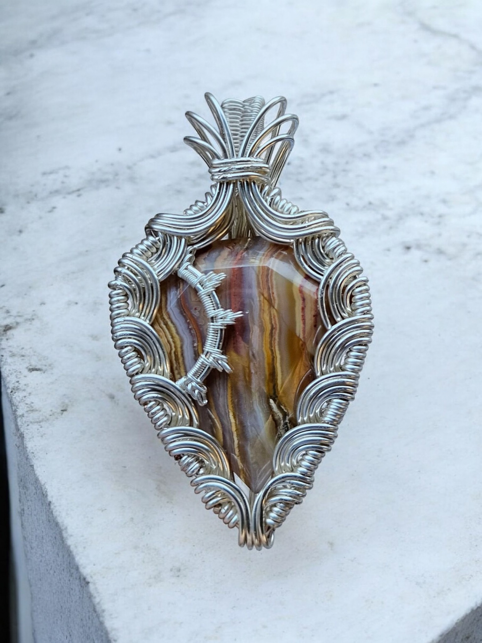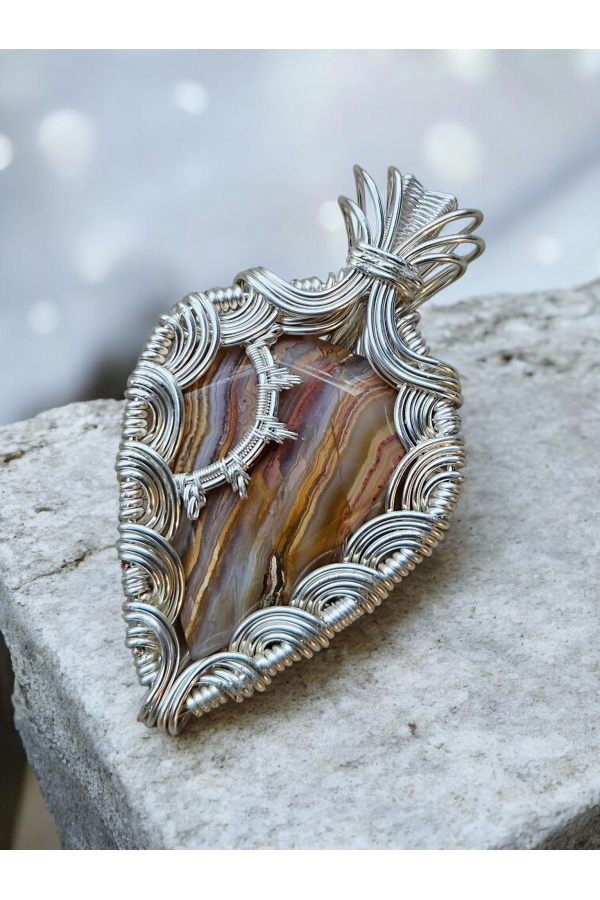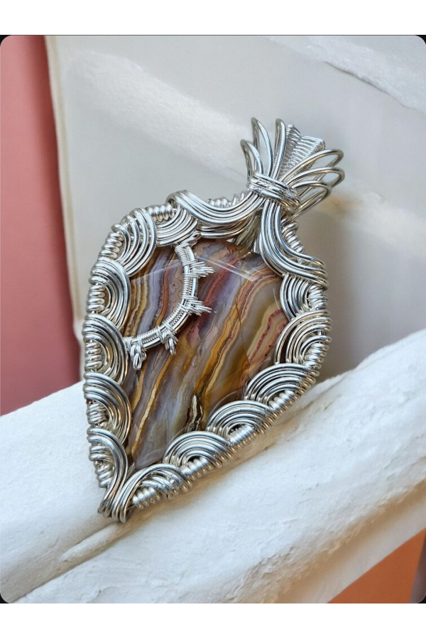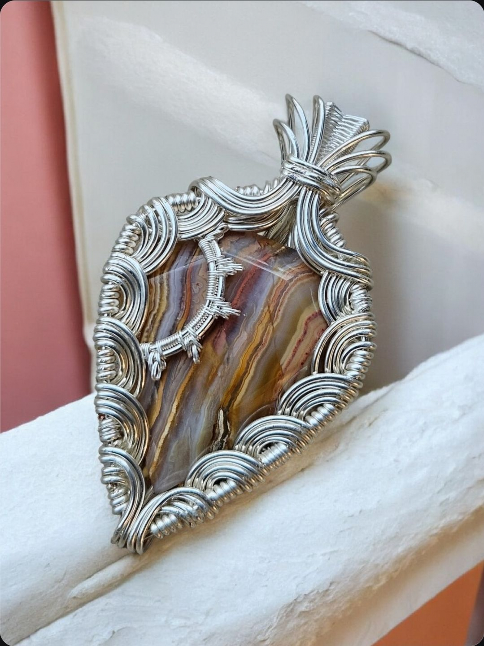 Beautiful. Crazy lace agate gemstone intricately wrapped by JoyAni Designs. measures 1.5" w" x 2.5"L.