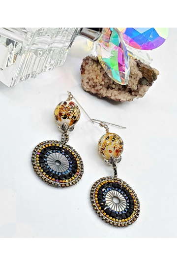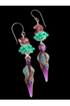 A fantasy of dripping goodness. These one of kind beauties showcase artisan Lampwork spikes and artisan lampwork urchins beads and vintage glass beads. Oxidized sterling silver ear hooks. Measure 2.5"