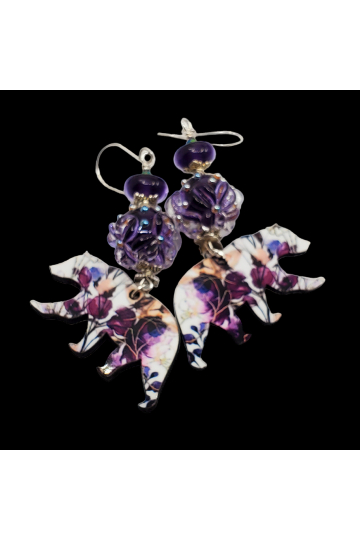 Artisan lampwork paired with designer made sterling silver brushed rings, adorned with Bali head pins and sterling ear hooks. MEASURE 2.75"