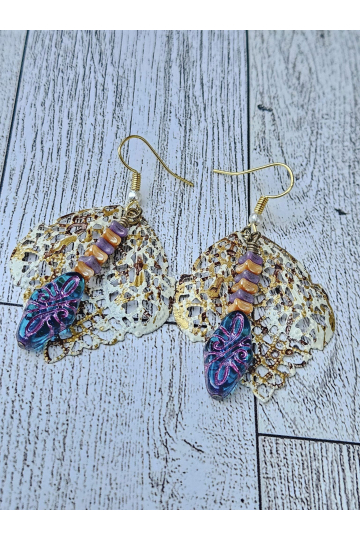Filigree leaves , Czech bead assortment dangle. Measure 2 34" Hand painted and sealed double sided beauties.
