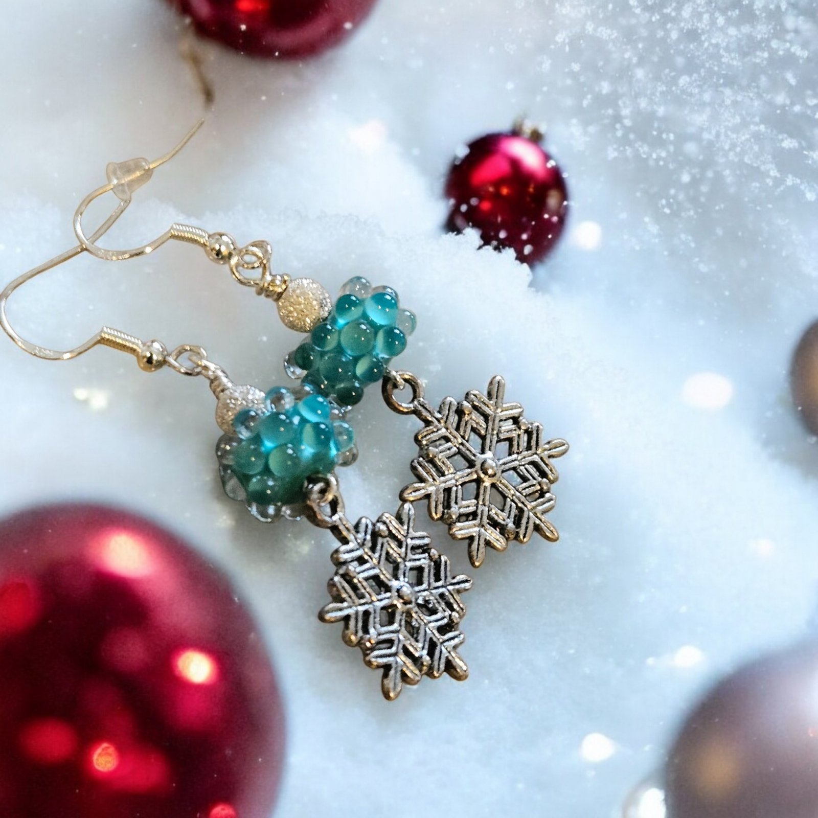 Artisan lampwork paired with snowflake charms and 925 sterling silver ear hooks. Measure 2.5"