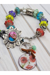 Design features: Artisan sterling silver barrel bead, artisan lampwork, Handcrafted sterling silver Kingsman turquoise and ruby red opal flower button closures, Karen Hill Tribe fine silver ring, sterling Bali beads, and bead caps, 11 Artisan crown jewel lampwork beads, 2 artisan made sterling bead crimps, African trade bead, artisan sterling twisted wire beads, 2 artisan lampwork spacers and an artisan enamel charm accented in high quality gemstones, genuine supple leather.