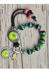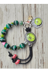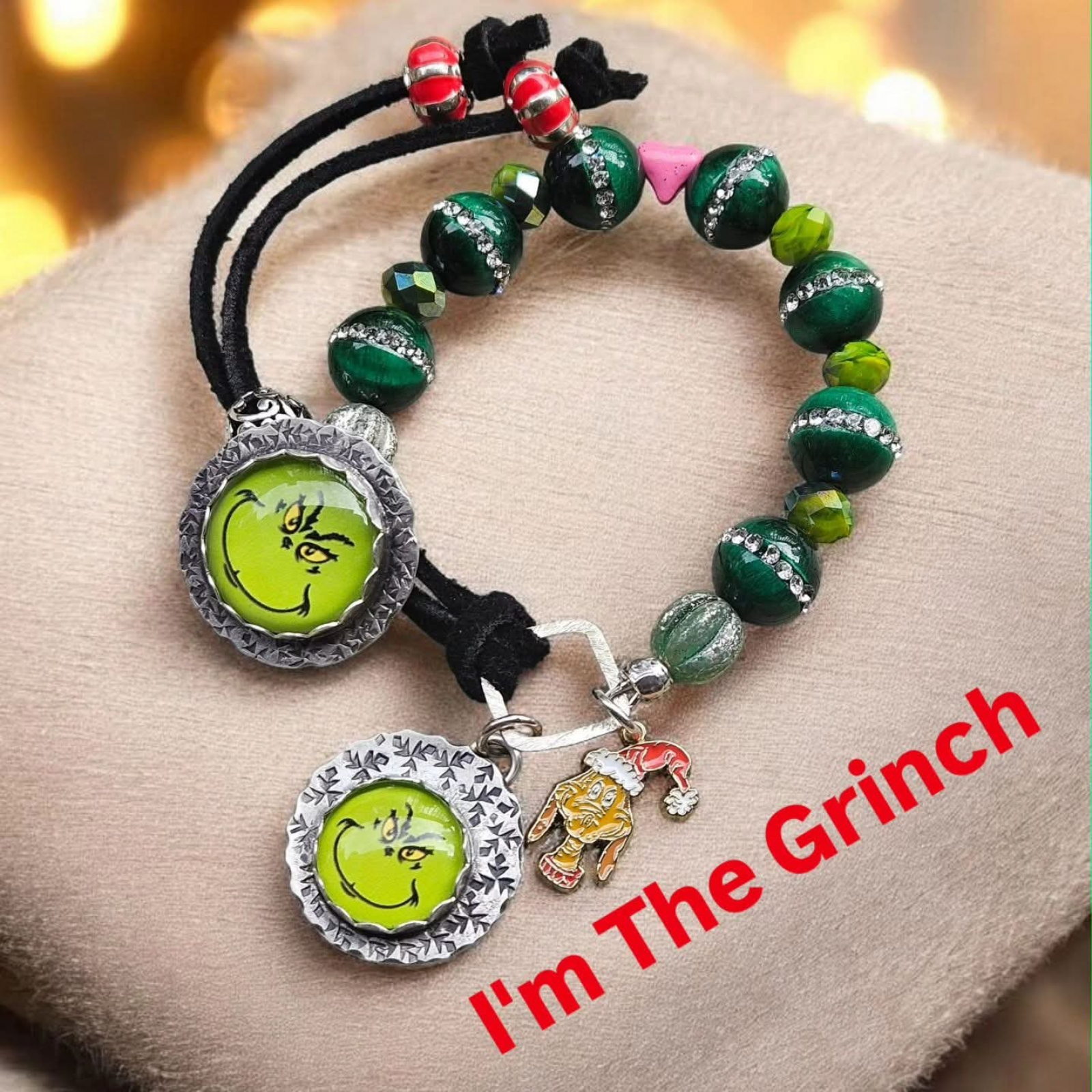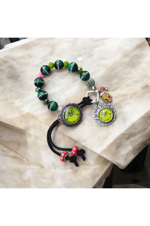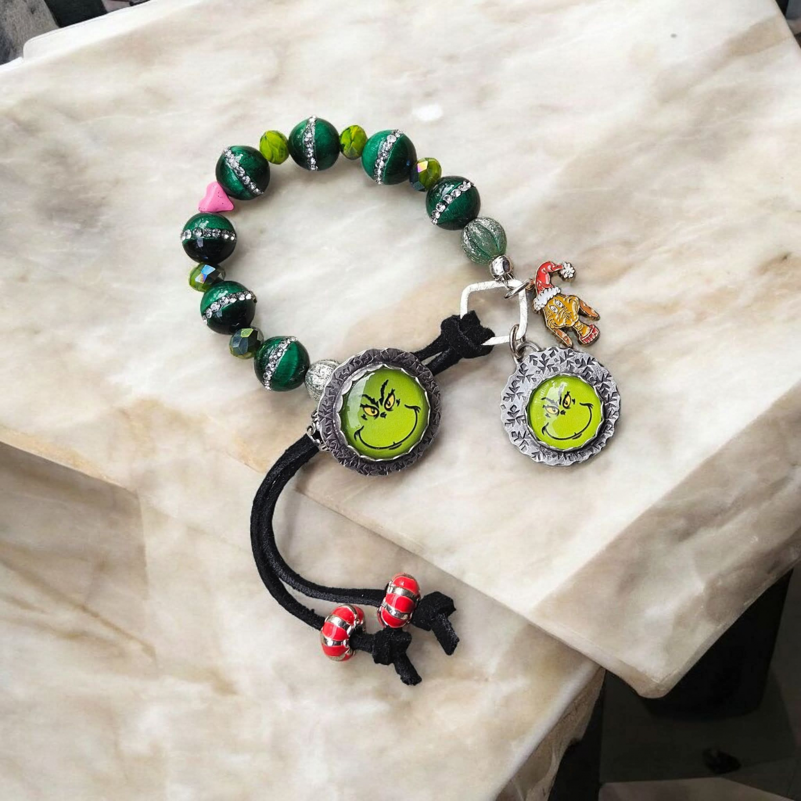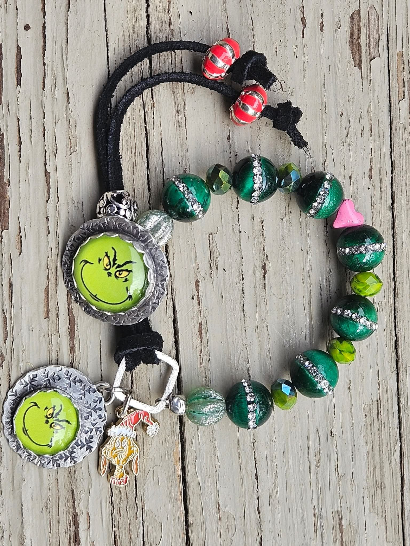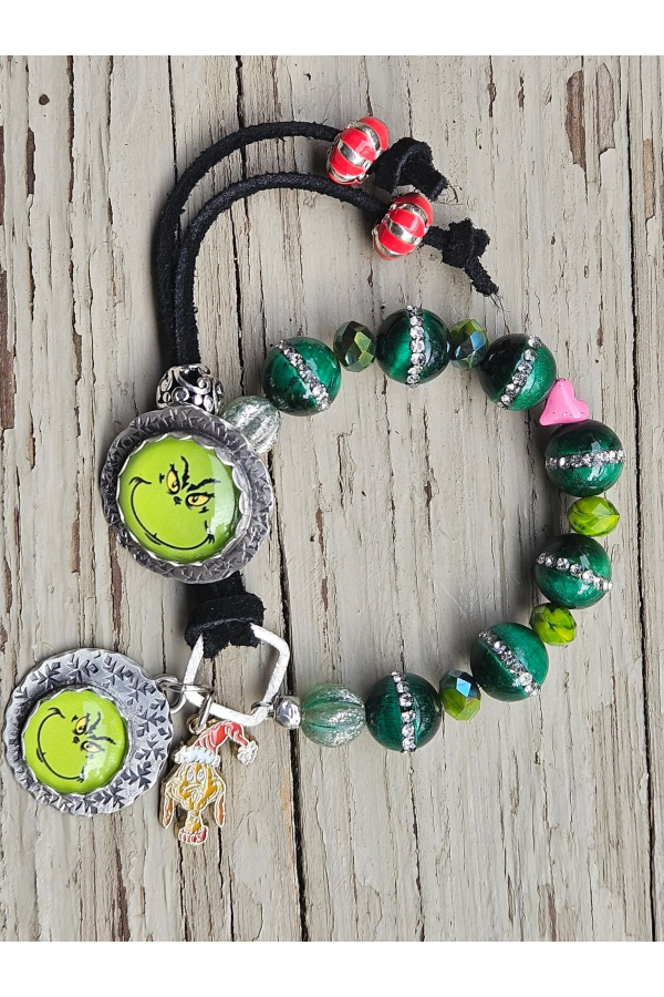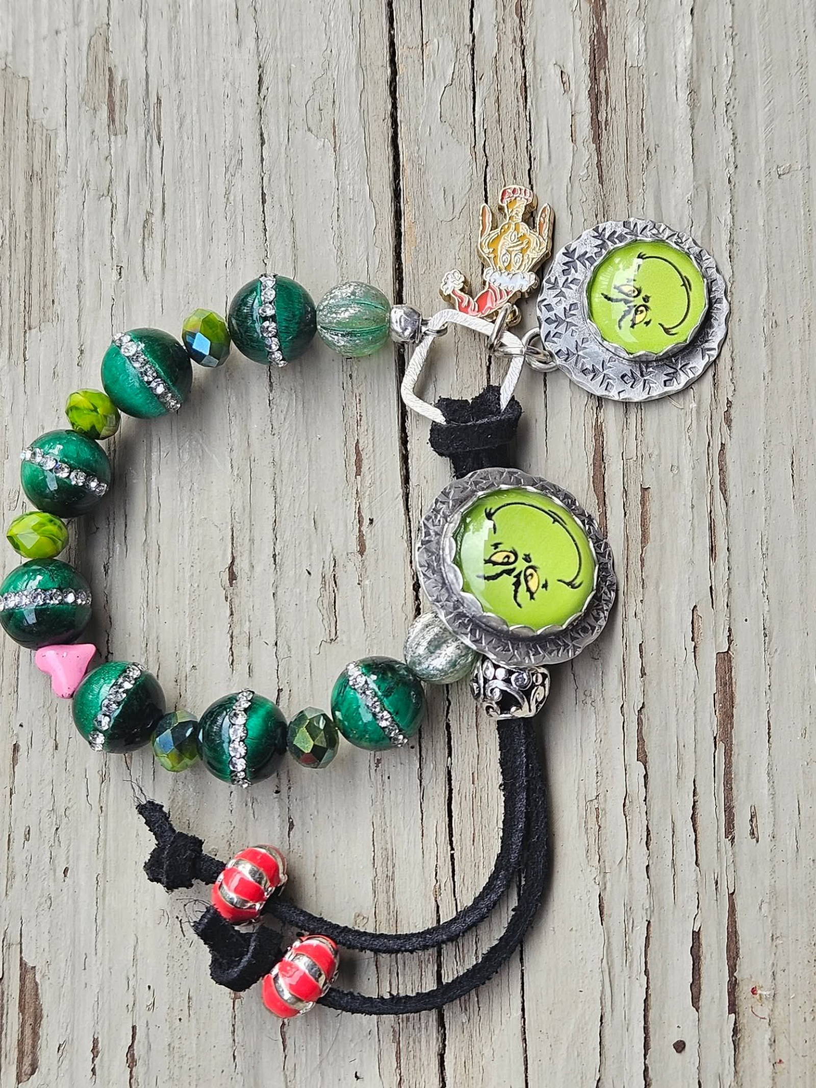 The fun arm candy consist of cubic zirconiia pave crystal tiger eye gemstones, enamel heart charm, faceted Czech rondelle, Czech melon beads, authentic Max enamel charm, supple genuine leather cord, silver slide clasp, artisan 925 sterling silver brsuhed ring, Handmade 925 sterling silver bead crimp, and custom collabration 925 sterling silver glass Grinch button and charm. Button measure 28mm charm with ring 29mm. Bracelet fita 6 3/4" - 7.5: . Adjuatable with slide of bead.