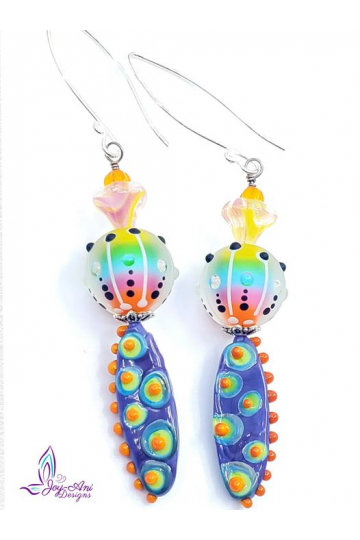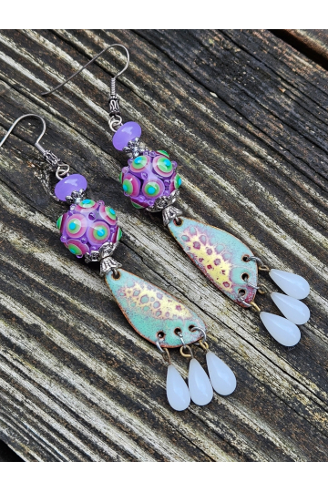 Combination of various artistsan designed paired to my perfection. Featuring cold porcelain eye charms Purple urchins artsan lampwork, gorgeous glowing inner layerd artisan lampwork, mixed with Swarovski bicones, sea sediment jasper heishi beads, howlite heshi and sterling silver fancy ear hooks. Measure 3.33"