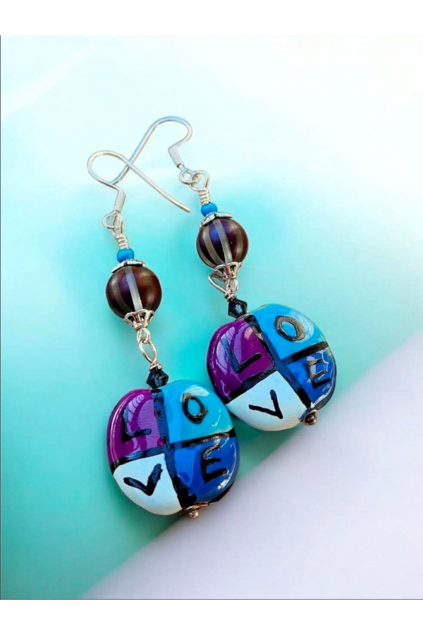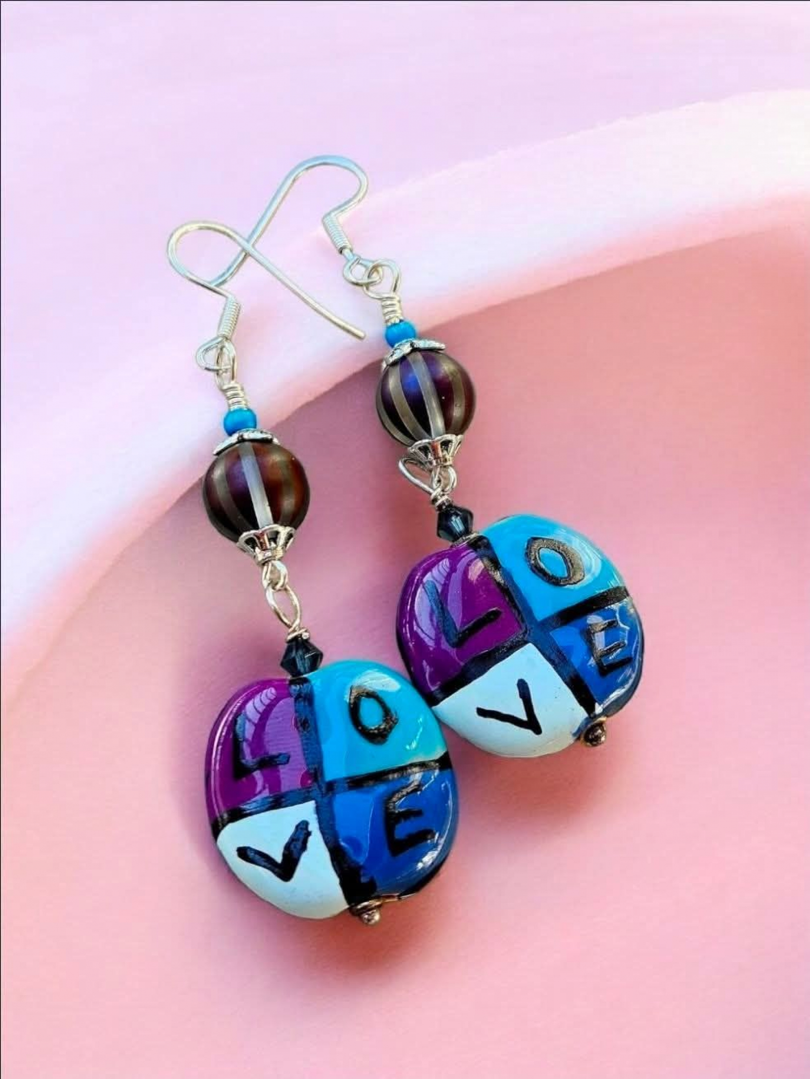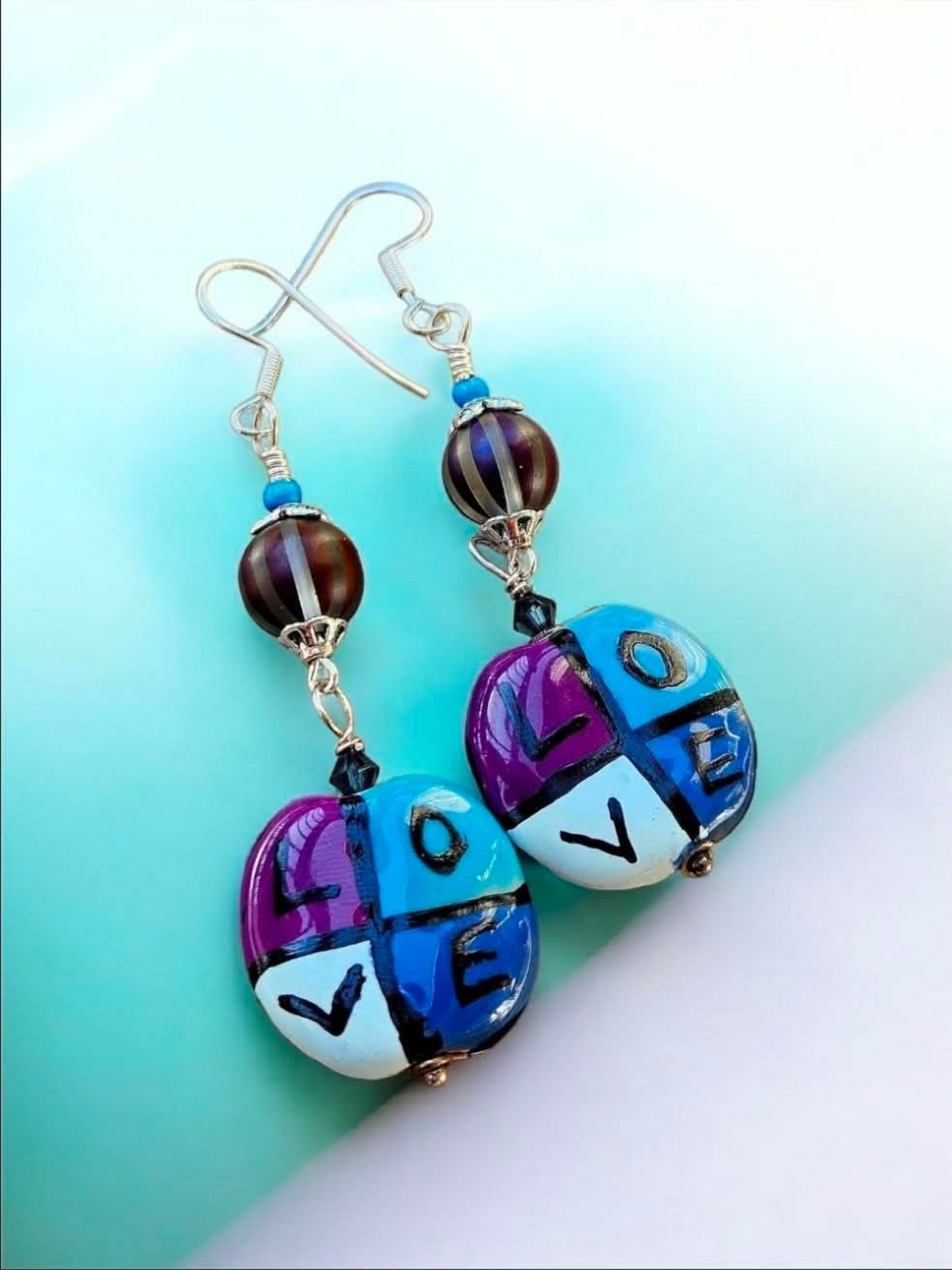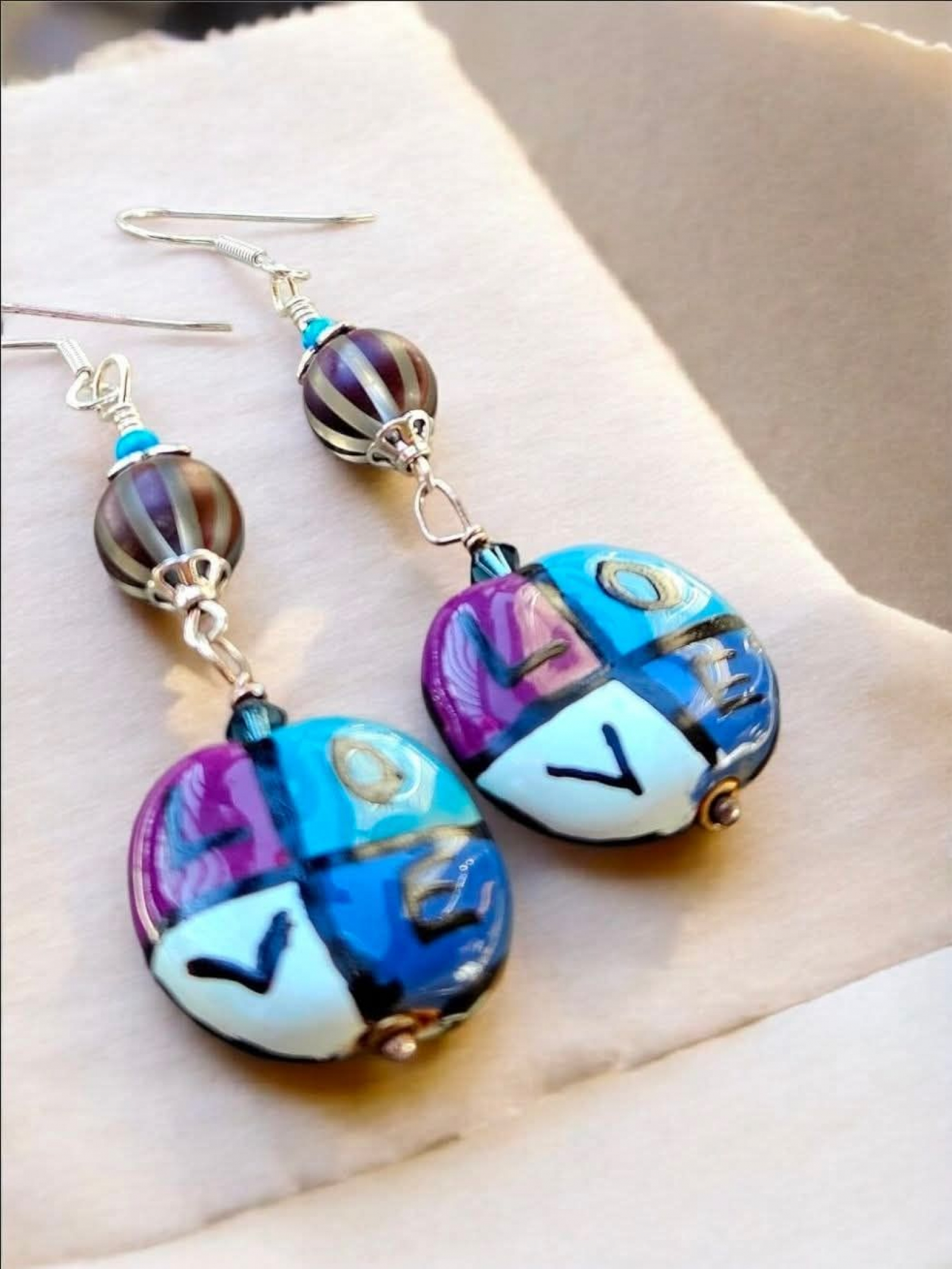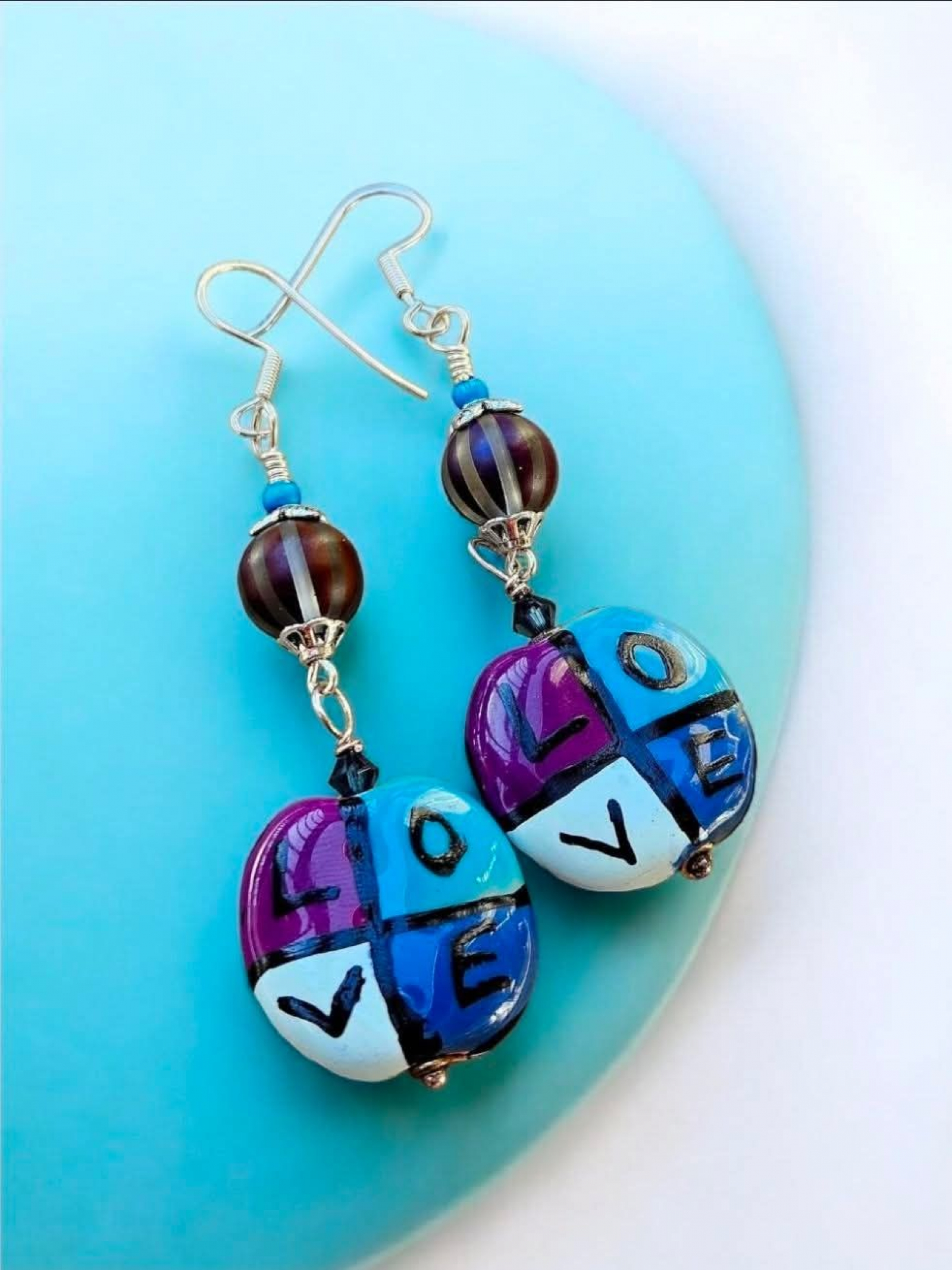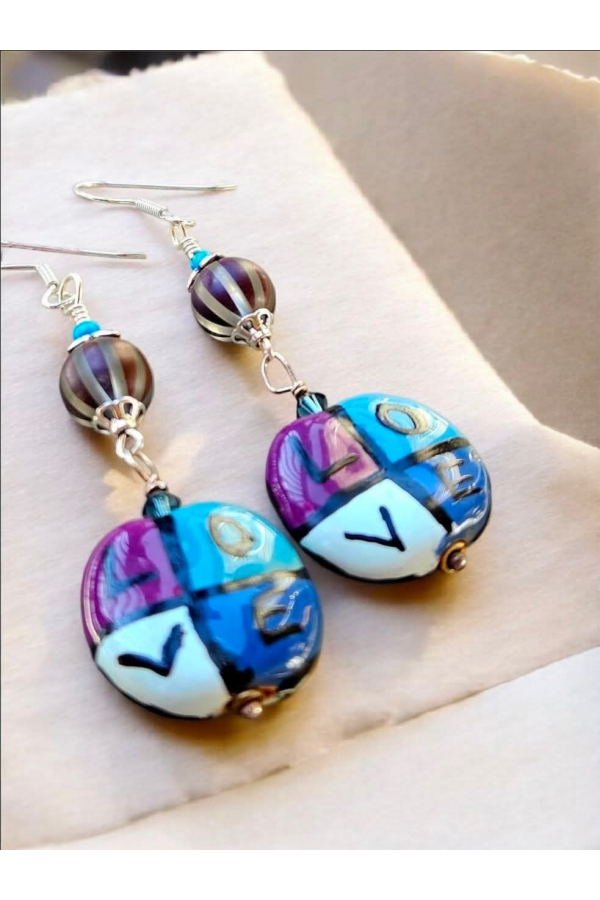 Beautiful African Clay ceramic lentils which are double-sided and artisan hand painted with "LOVE" accented lampwork beads, seed beads 925 sterling ear hooks. Measure 3"