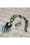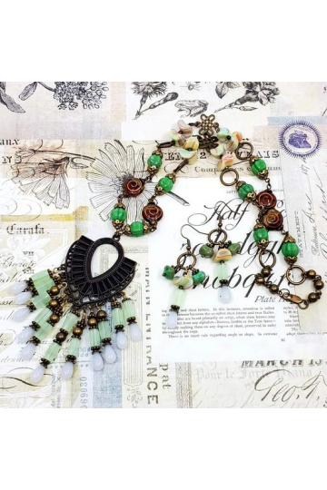 Lavish Bohemian necklace and earring set, featuring vintage Miriam Haskell headpins, vintage glass tubes, and assorted Czech beads. antiqued brass Chain measure 22" with lobster clasp closure pendant measures 3" comes with matching earrings. Measure 3" wt.5 grams ea.