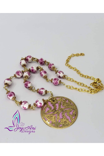 24" necklace with brass enameled overlay focal. antique gold spacer and pink floral ceramic beads. Hand coiled with gold wire. Lobster claps closure with extender chain.