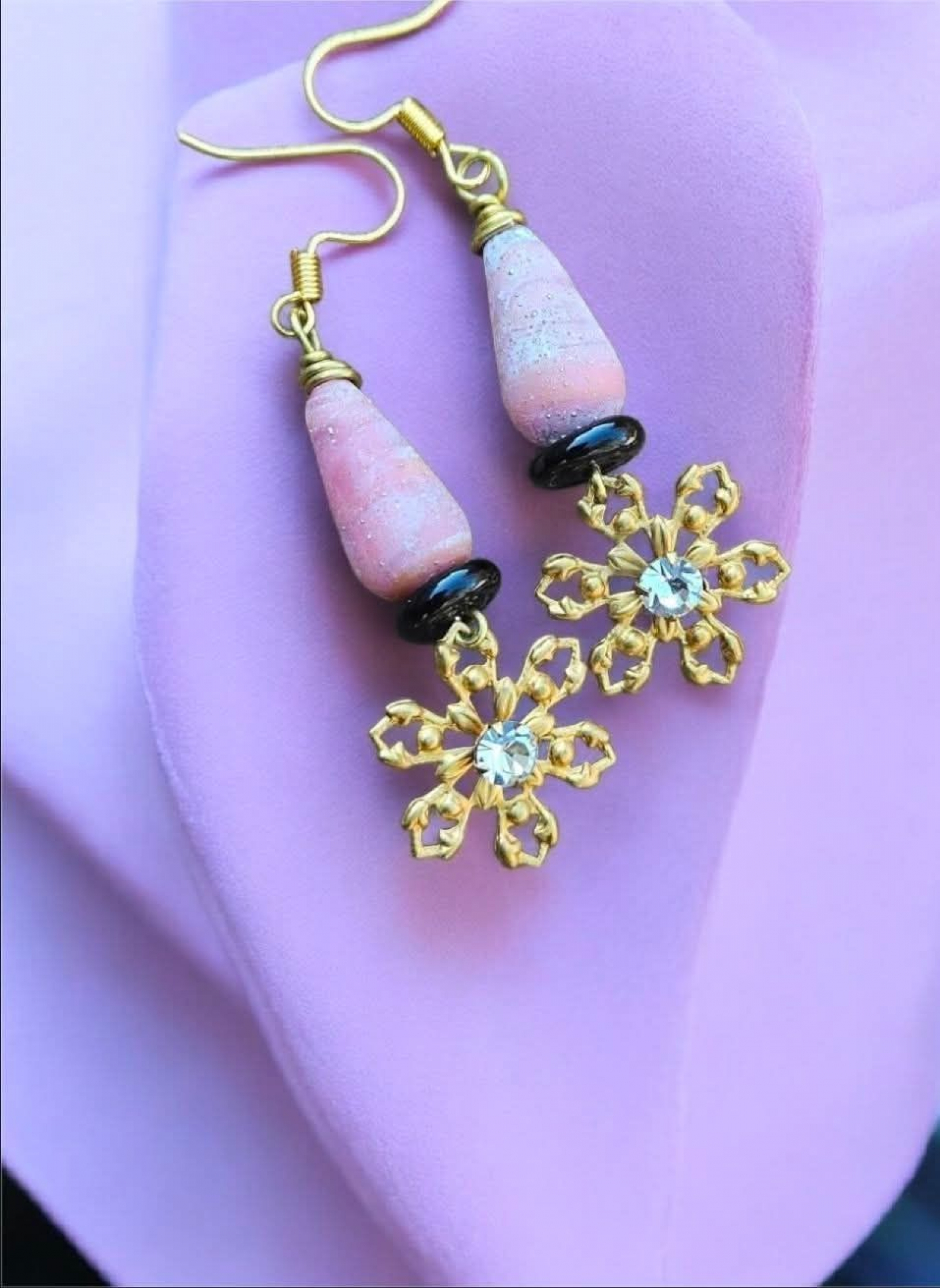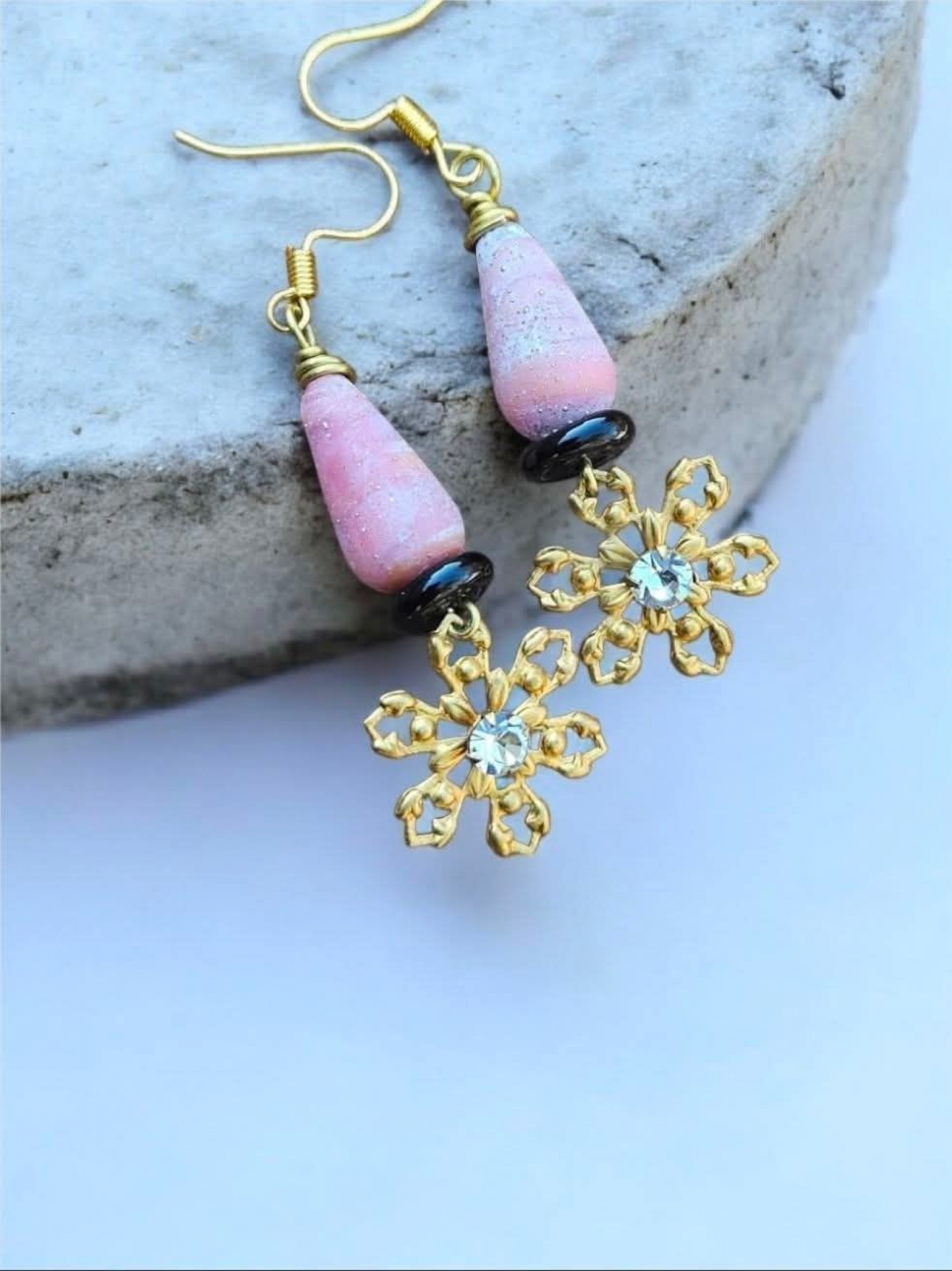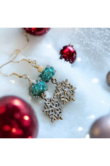 Gorgeous artisan lampwork paired with Brass Swarovski charms Snowflake charms.