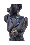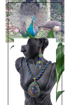 Stunning artisan made clay peacock feather focals paires with artisan lampwork bead woven to perfection. The necklace measures 20" with hook clasp cloaure earrings measure 3.5 with leverback ear hooks.