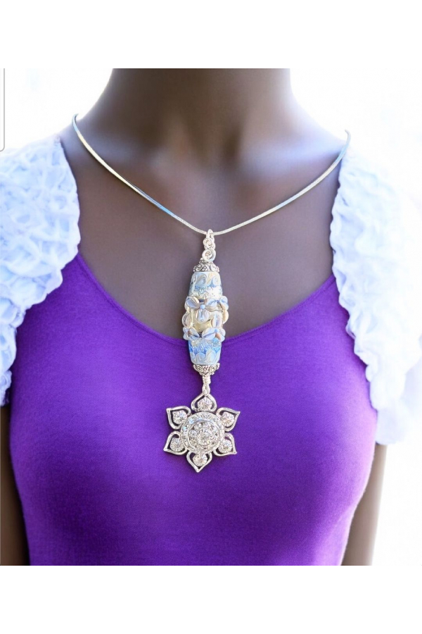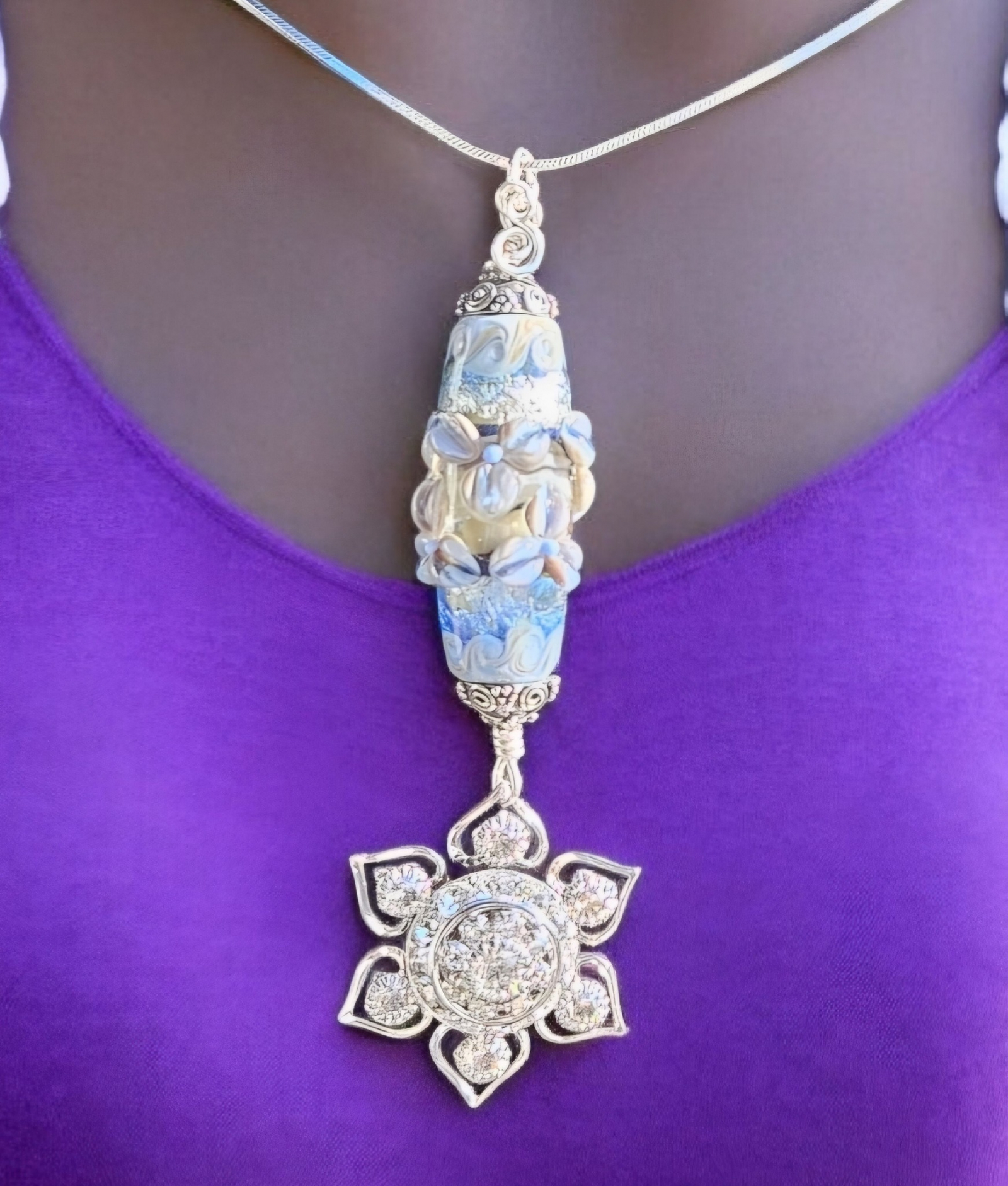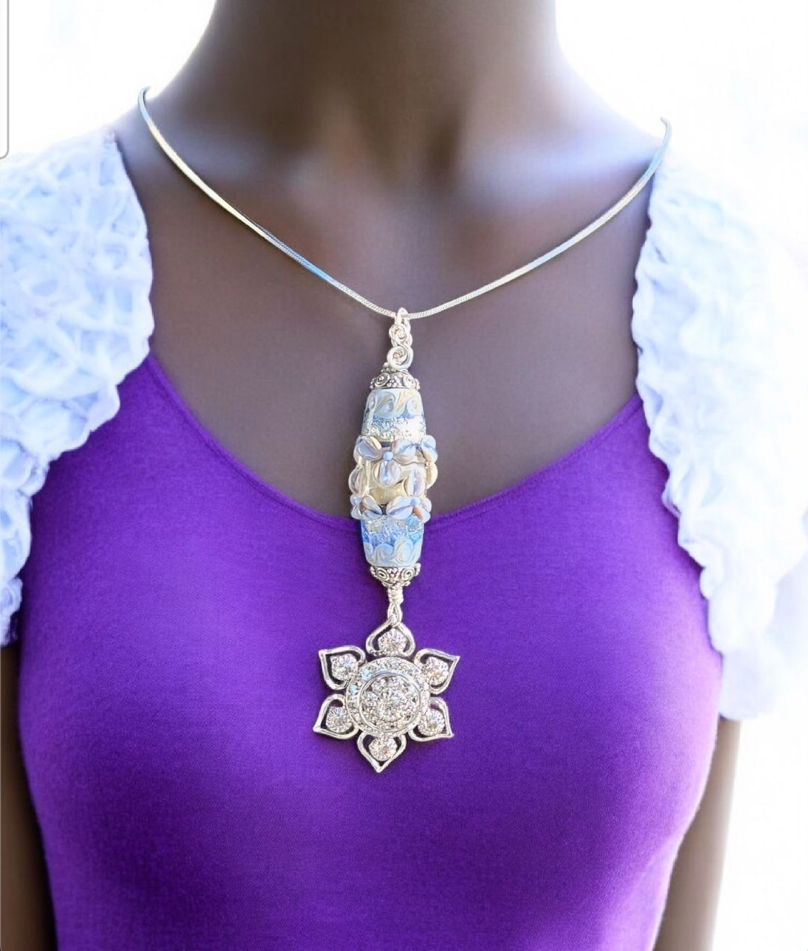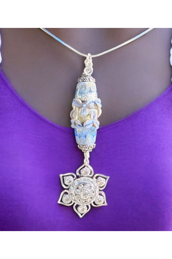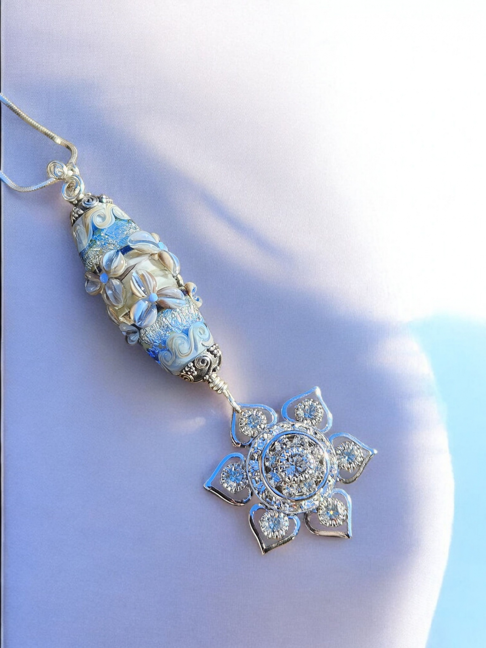 Gorgeous artisan lampwork focal paired with 925 sterling silver Swarovski crystal snowflake Charm Paired with 18" 925 sterling silver snake chain necklace.
