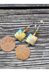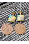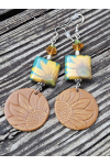 Beautiful double sided sunflower decoupage sublimation beads, paired with leather sunflower embossed charms. Czech o beads, Czech bell flowers and Swarvorski bicones. 925 sterling silver ear hooks.. Measure 3.5"