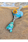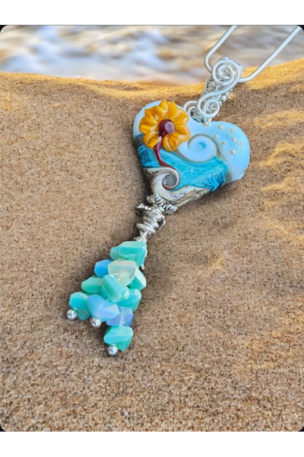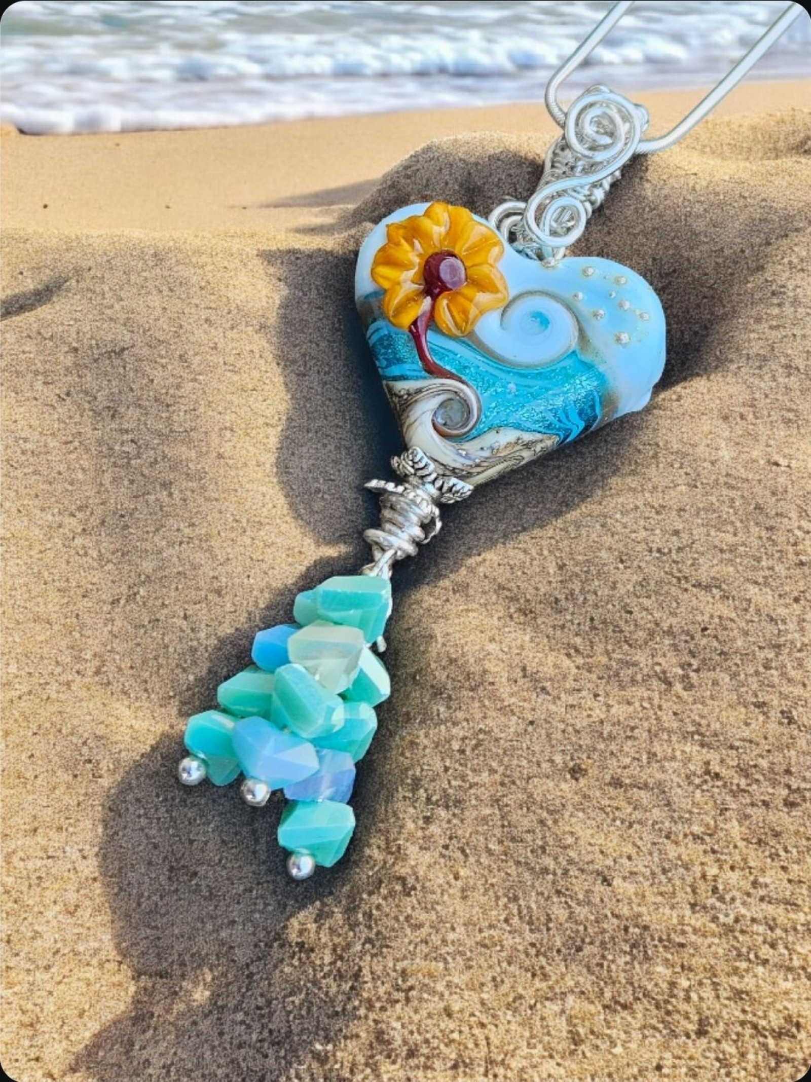 Beautiful double-sided artisan made OOAK lampwork heart mural. Highlighted with 925 sterling silver bail by yours truly, lovely 3 strand Czech tassel. This pendant measures.2.5" And dangles from and 18" 925 snake chain necklace.