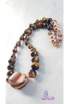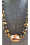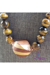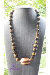 Beautiful graduated tiger's eye gemstones necklace embellished with large wooden focal and copper bead with v-hook clasp closure. Measure 20"