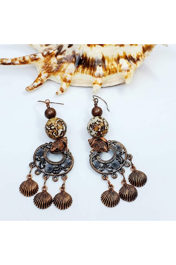 These ooak beauties display stunning petrified wood semi precious gems, antiqued copper base metal 3d conch shell charms, antique copper chandeliers with shell charms and ear wires. MEASURE 3.5" wt. 25 grams total